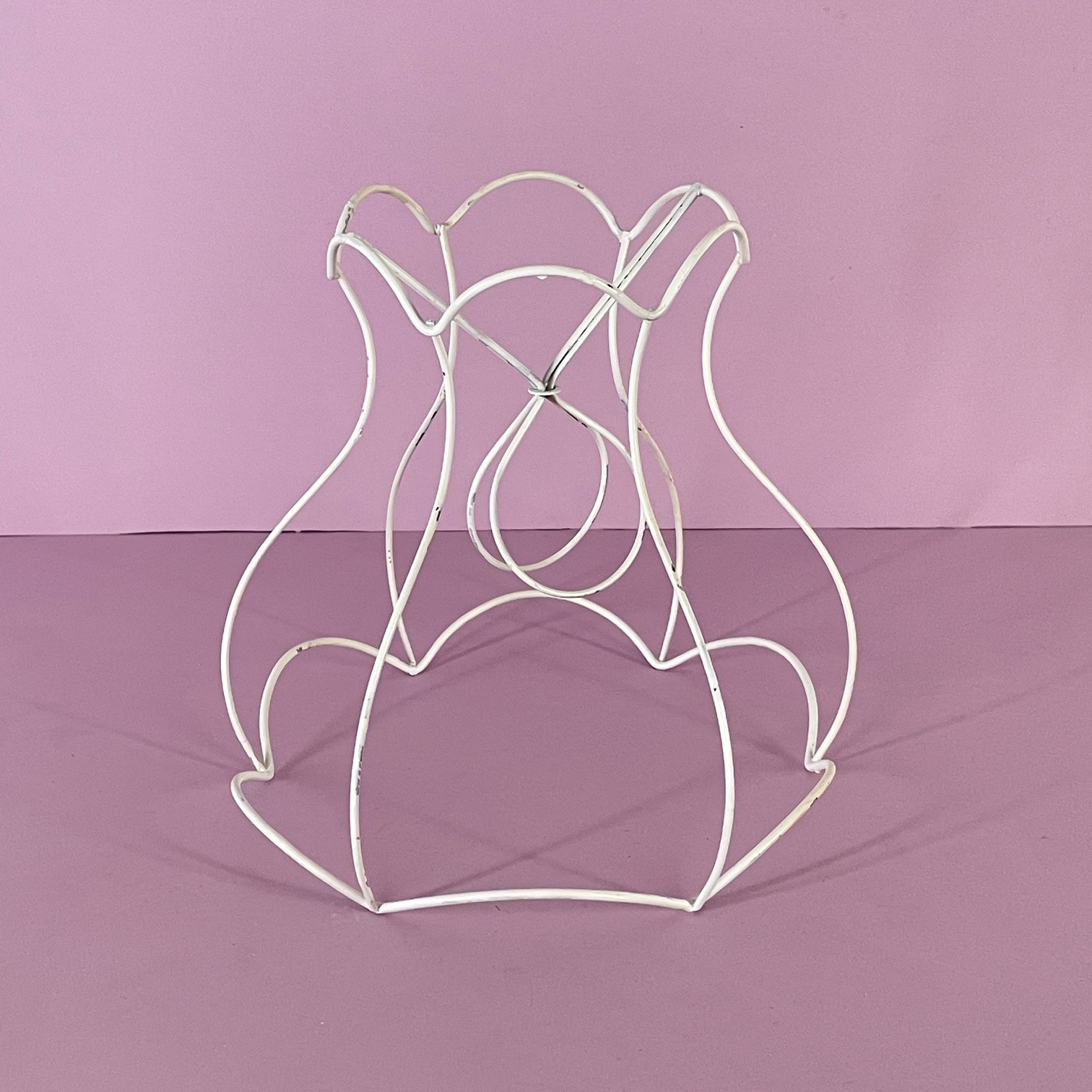 Lampstomme till bordslampa. Höjd 19 cm. Diameter uppe 12 cm, nere 19,5 cm. 6 stag. Fäste med klo E27. Rund snirklig form med svängiga stag, vågig upptill och nertill.