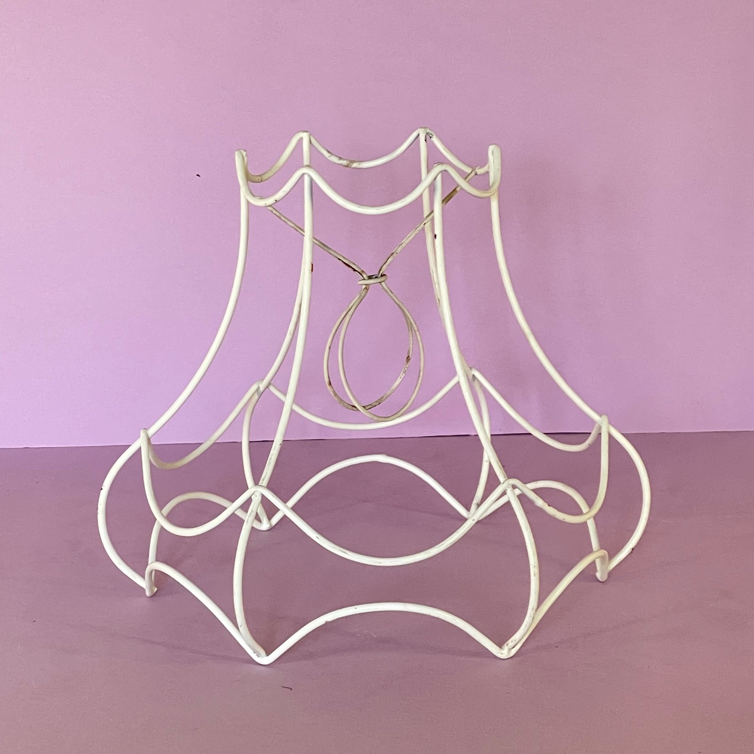 Lampstomme till bordslampa. Höjd 20 cm. Diameter uppe 11,5 cm, nere 24,5 cm. 6 stag. Fäste med klo E27. Rund sirlig form med böjda stag, vågig upptill och dubbelt vågig nertill.